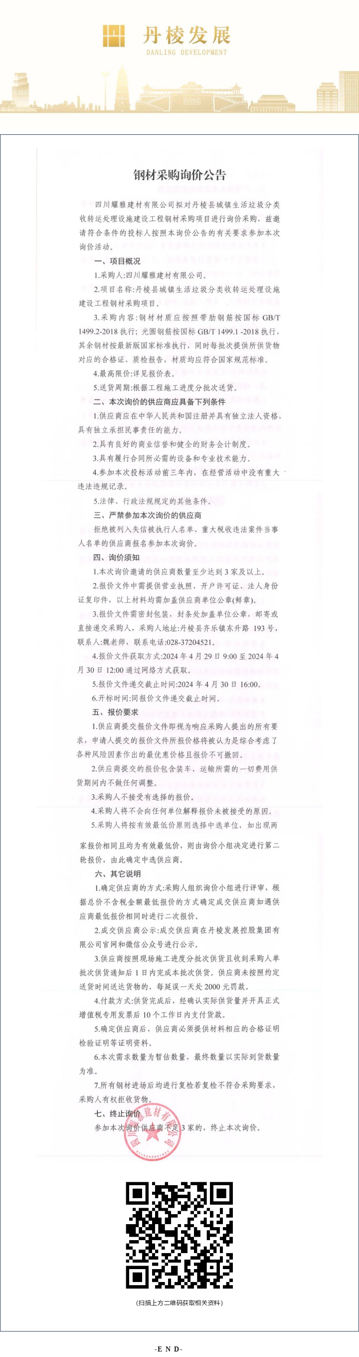 丹棱縣城鎮(zhèn)生活垃圾分類收轉(zhuǎn)運(yùn)處理設(shè)施建設(shè)工程鋼材采購項目詢價公告