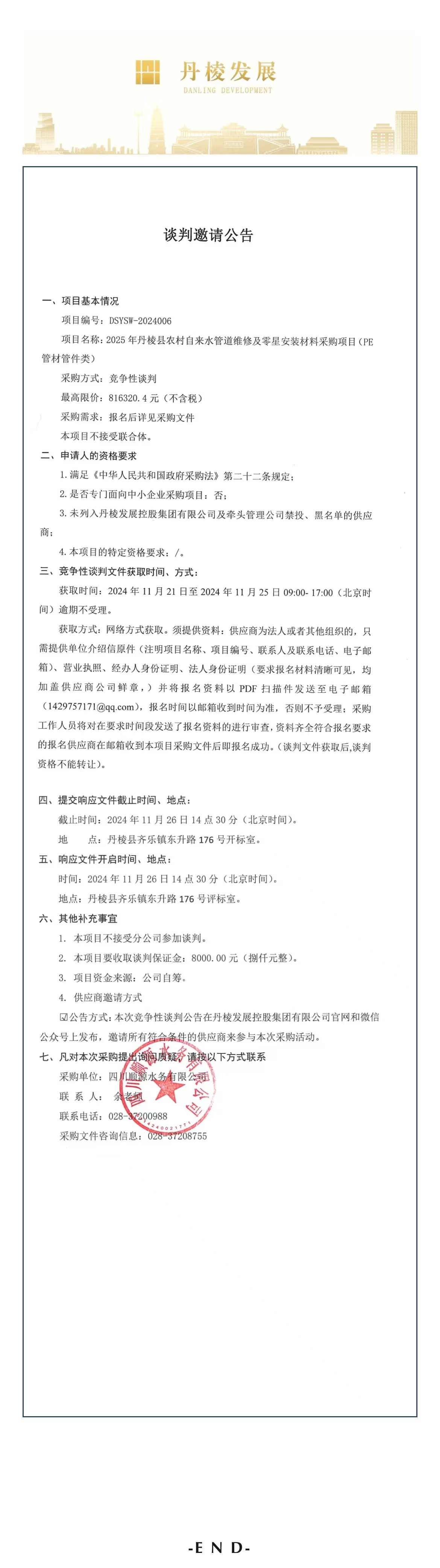 2025年丹棱縣農(nóng)村自來水管道維修及零星安裝材料采購項(xiàng)目(PE管材管件類)談判邀請(qǐng)公告