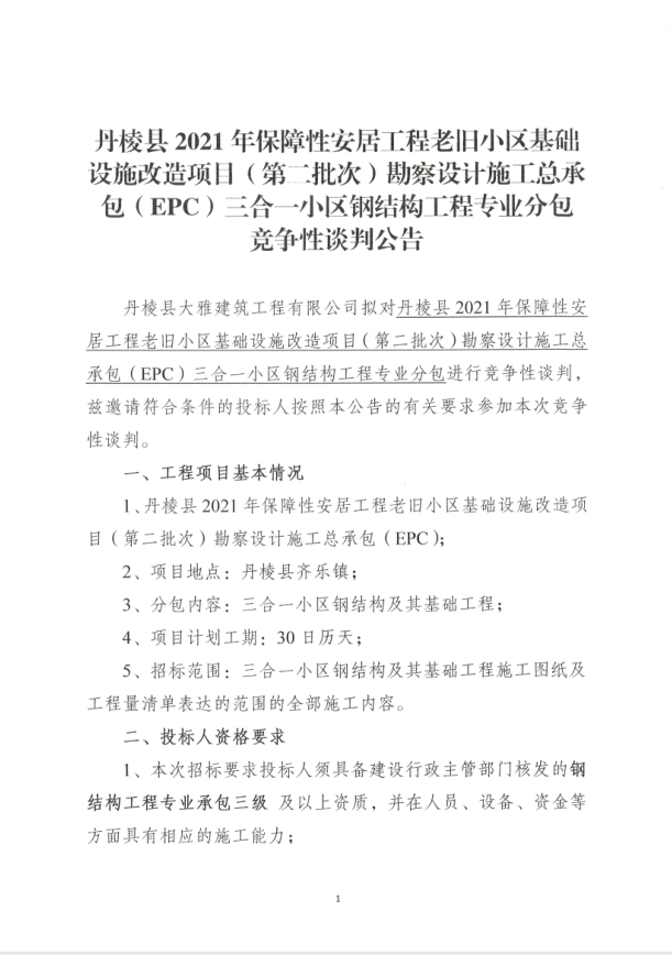 【大雅建筑公司】丹棱縣2021年保障性安居工程老舊小區(qū)基礎(chǔ)設(shè)施改造項(xiàng)目(第二批次)勘察設(shè)計施工總承包(EPC)三合一小區(qū)鋼結(jié)構(gòu)工程專業(yè)分包競爭性談判公告