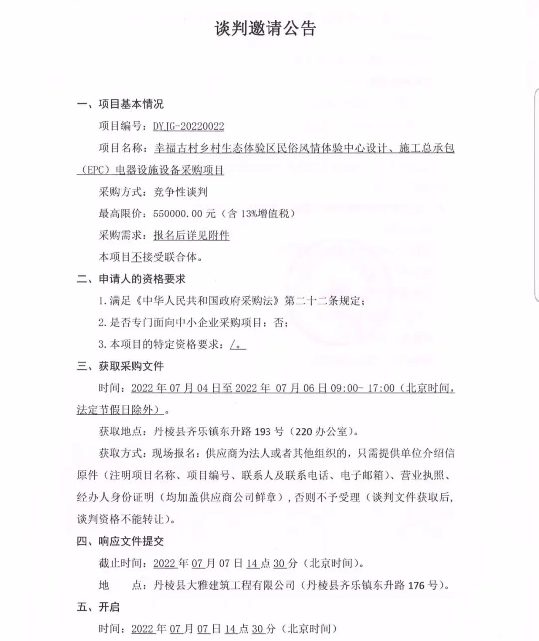 幸福古村鄉(xiāng)村生態(tài)體驗(yàn)區(qū)民俗風(fēng)情體驗(yàn)中心設(shè)計、施工總承包(EPC)電器設(shè)施設(shè)備采購項目談判邀請公告