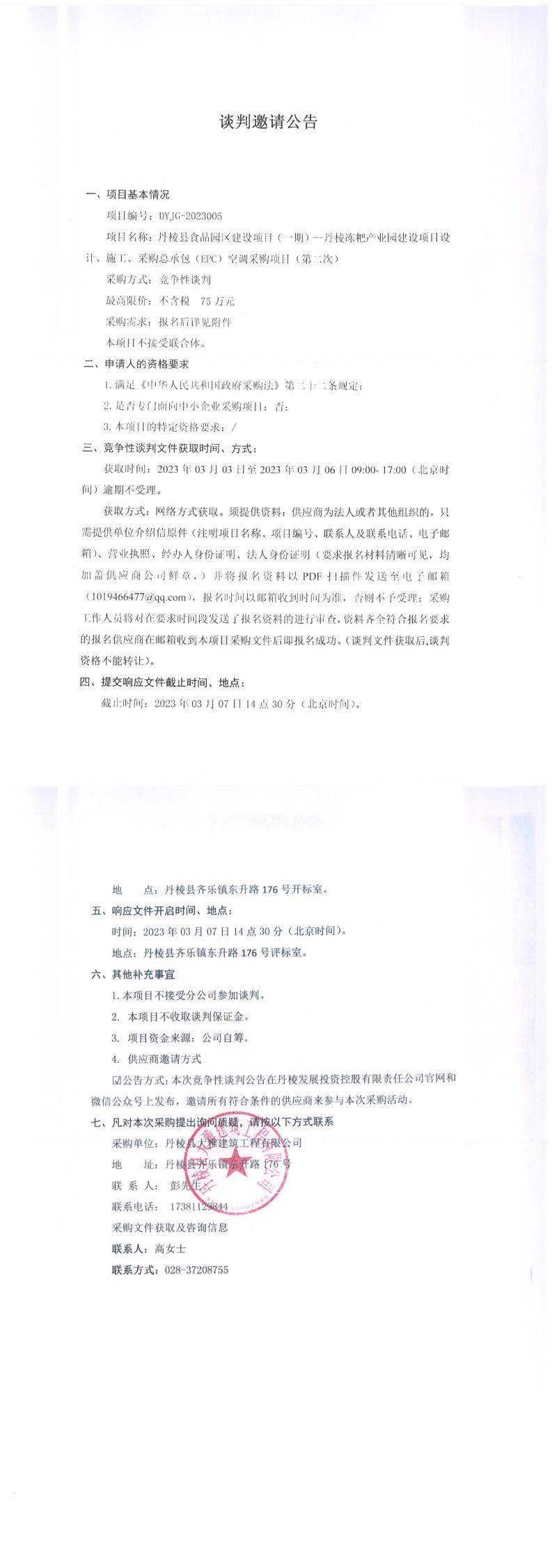 丹棱縣食品園區(qū)建設(shè)項目(一期)--丹棱凍粑產(chǎn)業(yè)園建設(shè)項目設(shè)計、施工、采購總承包(EPC)空調(diào)采購項目(第二次)談判邀請公告
