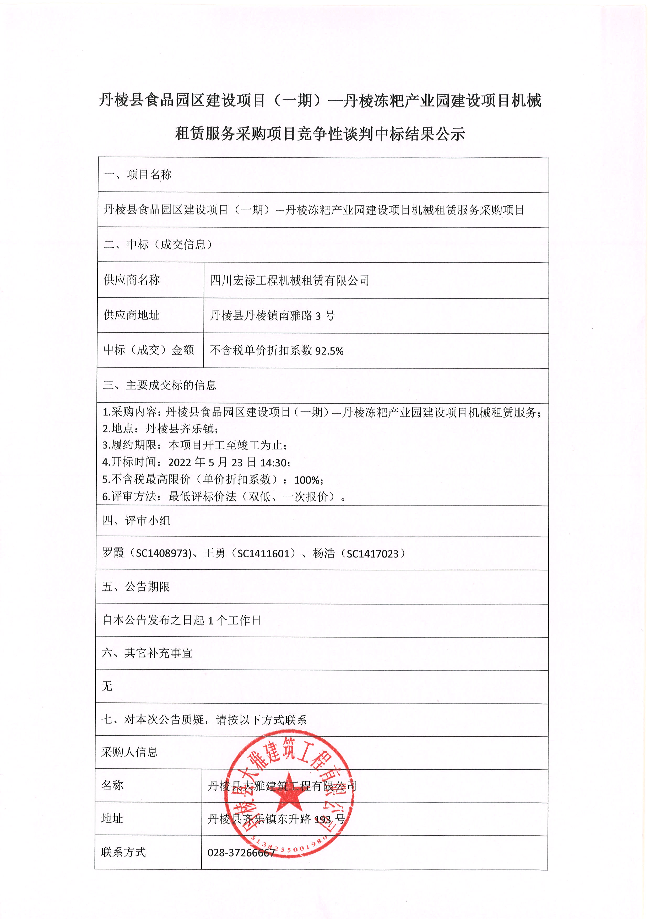 丹棱縣食品園區(qū)建設(shè)項(xiàng)目(一期)-丹棱凍粑產(chǎn)業(yè)園建設(shè)項(xiàng)目機(jī)械 租賃服務(wù)采購項(xiàng)目競爭性談判中標(biāo)結(jié)果公示