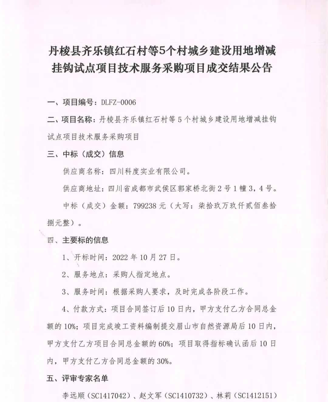 丹棱縣齊樂鎮(zhèn)紅石村等5個(gè)村城鄉(xiāng)建設(shè)用地增減掛鉤試點(diǎn)項(xiàng)目技術(shù)服務(wù)采購項(xiàng)目成交結(jié)果公告