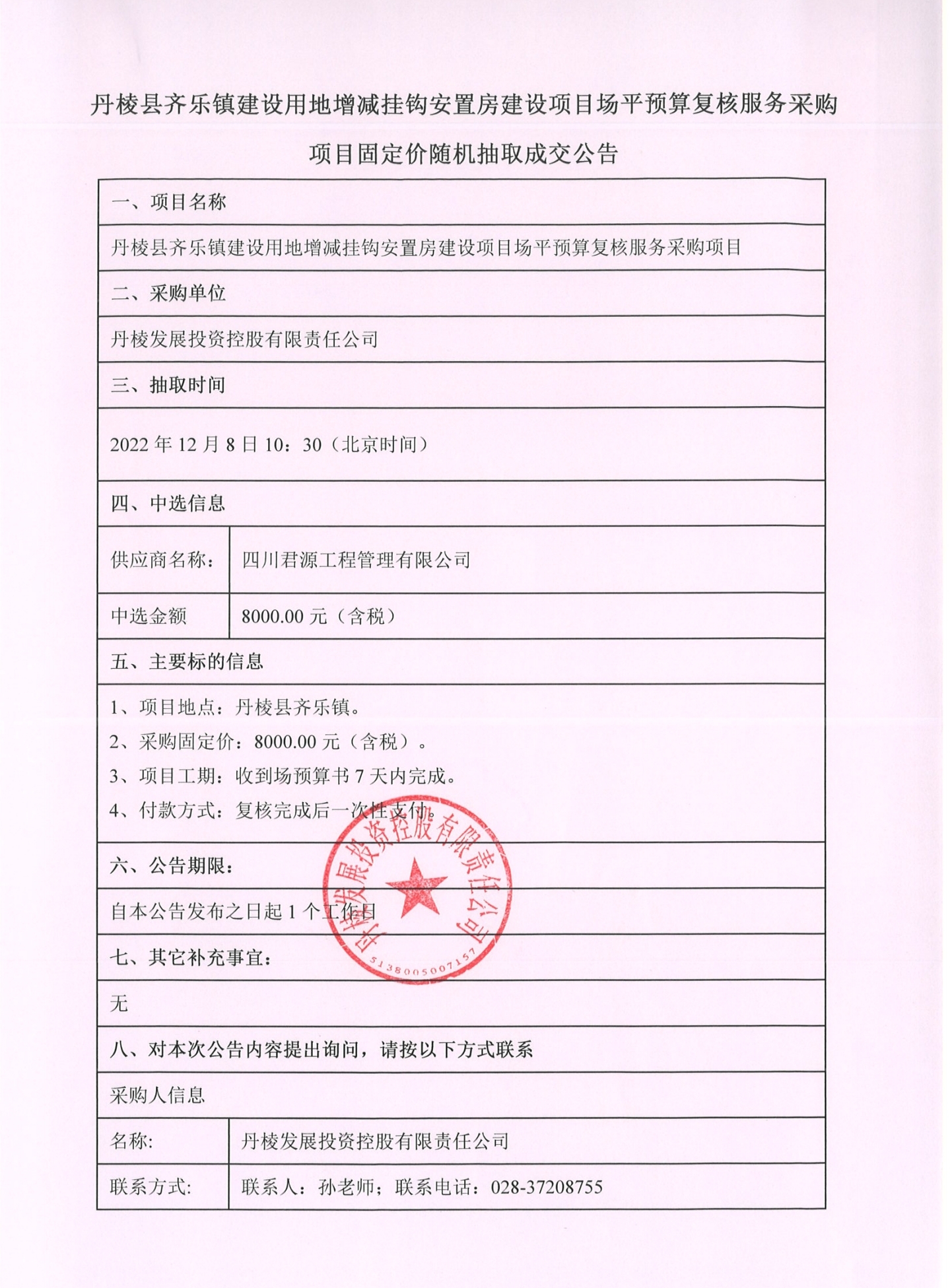 丹棱縣齊樂鎮(zhèn)建設(shè)用地增減掛鉤安置房建設(shè)項(xiàng)目場平預(yù)算復(fù)核服務(wù)采購項(xiàng)目固定價(jià)隨機(jī)抽取成交公告