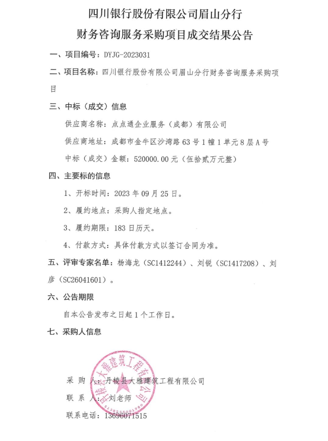 四川銀行股份有限公司眉山分行財(cái)務(wù)咨詢服務(wù)采購(gòu)項(xiàng)目成交結(jié)果公告