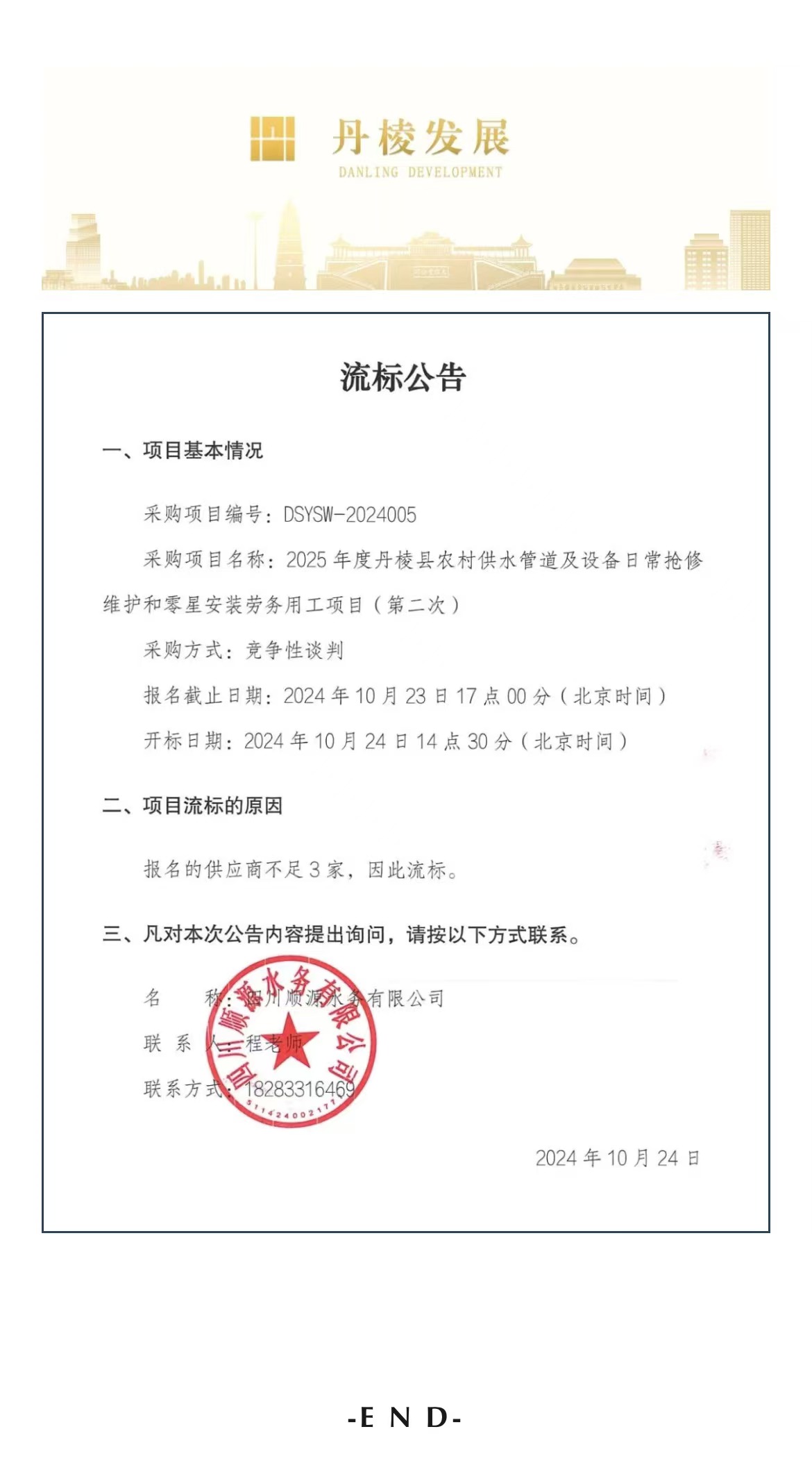 2025年度丹棱縣農(nóng)村供水管道及設(shè)備日常搶修維護(hù)和零星安裝勞務(wù)用工項(xiàng)目(第二次)流標(biāo)公告