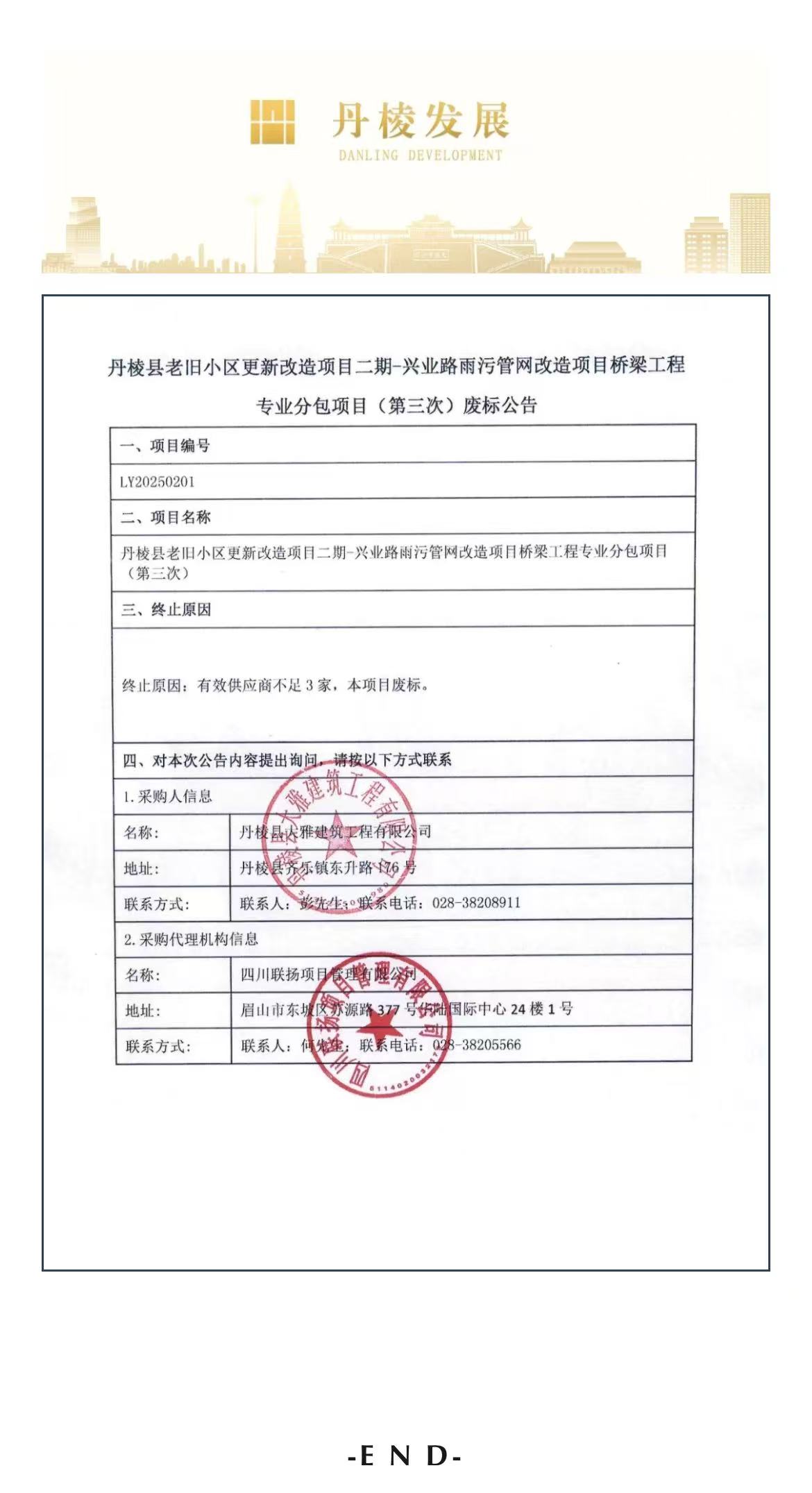 丹棱縣老舊小區(qū)更新改造項目二期-興業(yè)路雨污管網(wǎng)改造項目橋梁工程專業(yè)分包項目(第三次)廢標公告