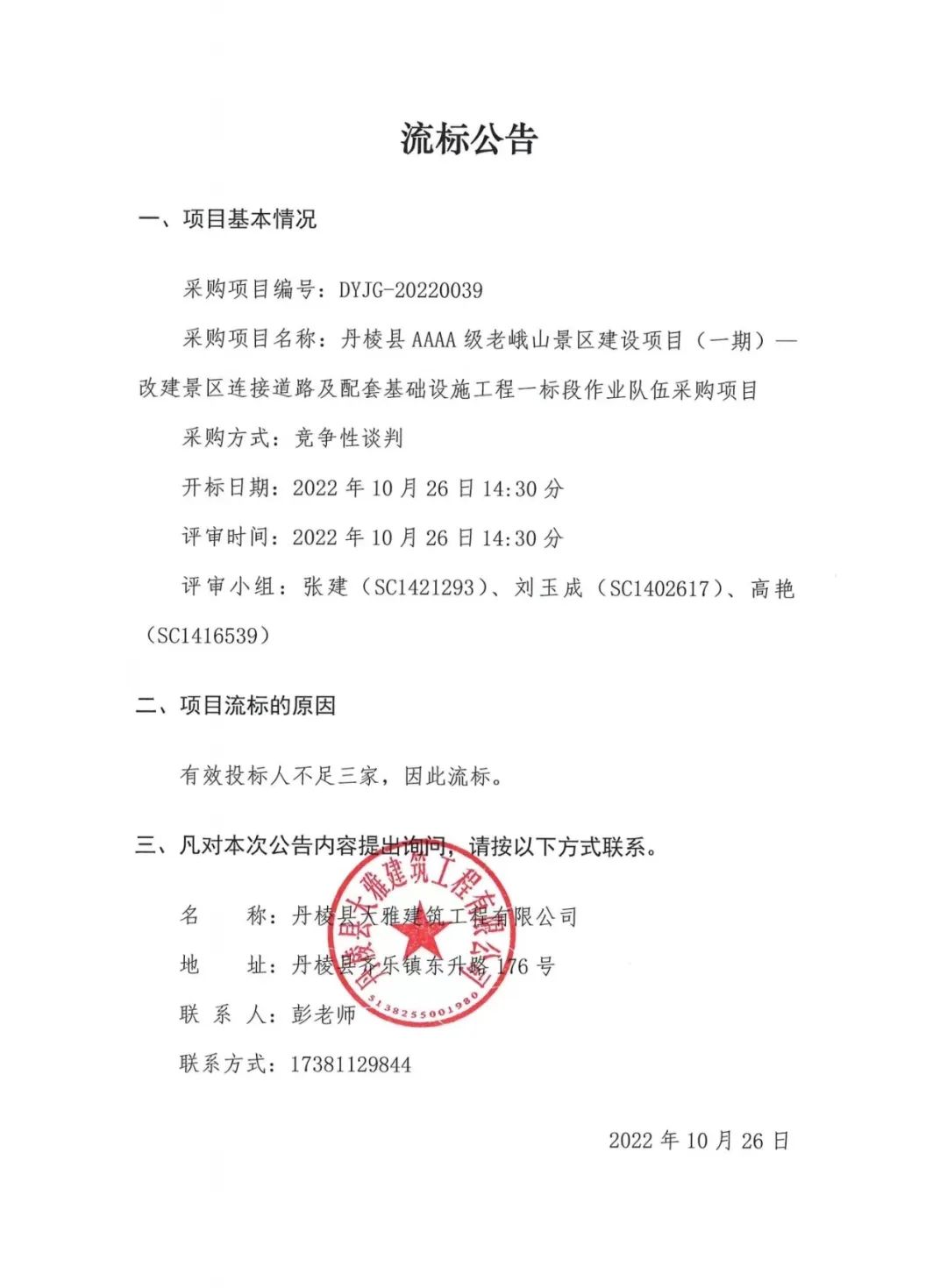 丹棱縣AAAA級老峨山景區(qū)建設(shè)項(xiàng)目(一期)--改建景區(qū)連接道路及配套基礎(chǔ)設(shè)施工程一標(biāo)段作業(yè)隊(duì)伍采購項(xiàng)目流標(biāo)公告
