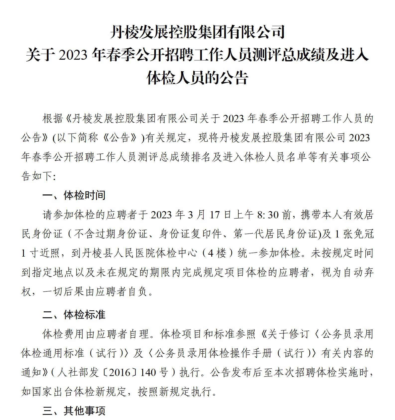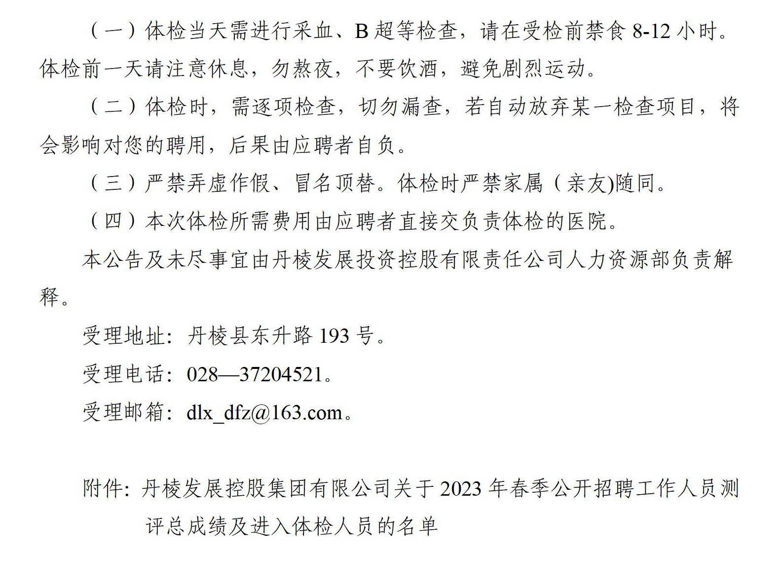 丹棱發(fā)展控股集團有限公司關(guān)于2023年春季公開招聘工作人員測評總成績及進入體檢人員的公告