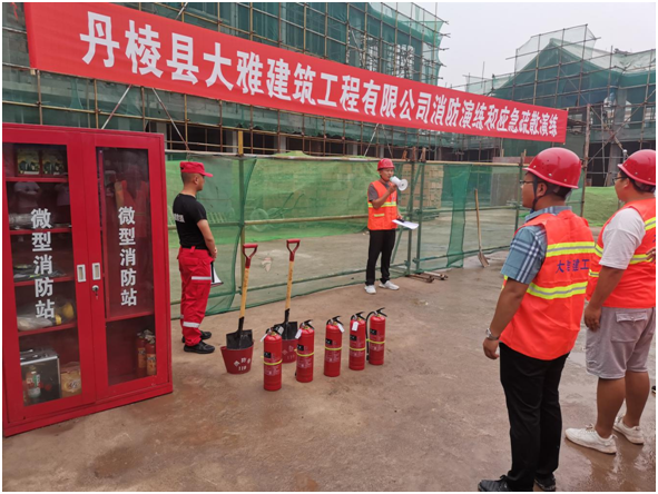 為進(jìn)一步提高丹棱縣大雅建筑工程有限公司(以下簡(jiǎn)稱(chēng)“縣大雅建筑公司”)全體工作人員消防安全意識(shí)和應(yīng)急處置能力,6月24日,我司在仁美鎮(zhèn)雙橋社區(qū)農(nóng)副產(chǎn)品交易中心項(xiàng)目(以下簡(jiǎn)稱(chēng)“雙橋項(xiàng)目”)施工現(xiàn)場(chǎng)組織開(kāi)展了一場(chǎng)消防應(yīng)急演練,此次演練邀請(qǐng)到丹棱發(fā)展投資控股有限責(zé)任公司相關(guān)領(lǐng)導(dǎo)和部室人員觀摩指導(dǎo)。