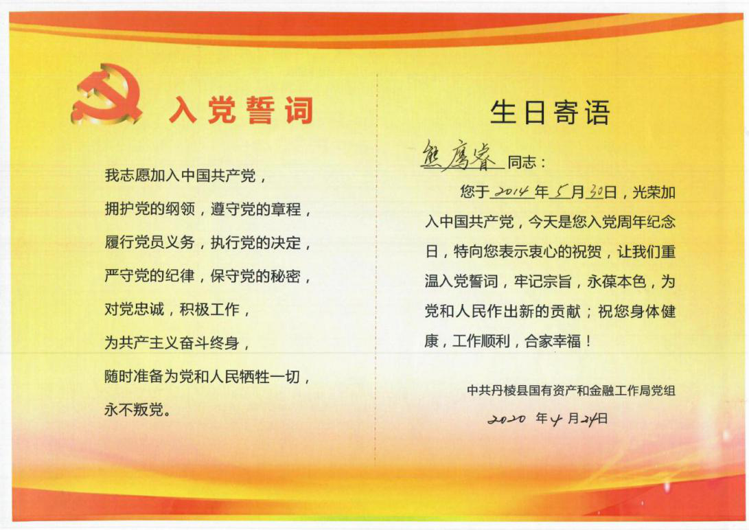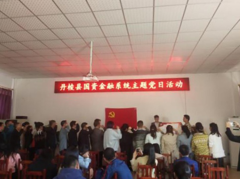 工作安排后,縣國(guó)資金融局黨組集體為5月入黨黨員過(guò)政治生日,縣國(guó)資金融局(縣金融服務(wù)中心)副主任茍永慶同志為“過(guò)生日”的黨員們送上精心制作的“黨員政治生日卡”,勉勵(lì)黨員同志要“常思入黨初衷、銘記入黨誓詞、牢記黨員義務(wù)”,發(fā)揮黨員先鋒模范作用,在今后的工作中不斷創(chuàng)先爭(zhēng)優(yōu),做好表率;顒(dòng)最后,全體黨員同志在縣國(guó)資金融局黨組成員、副局長(zhǎng)潘國(guó)榮同志的帶領(lǐng)下重溫入黨誓詞、面對(duì)黨旗莊嚴(yán)宣誓。